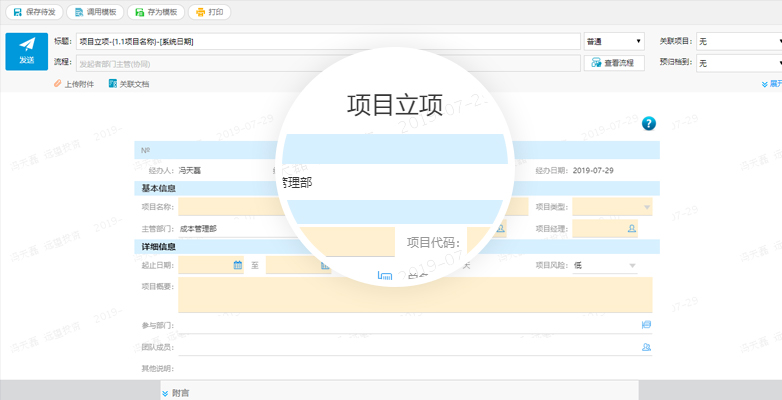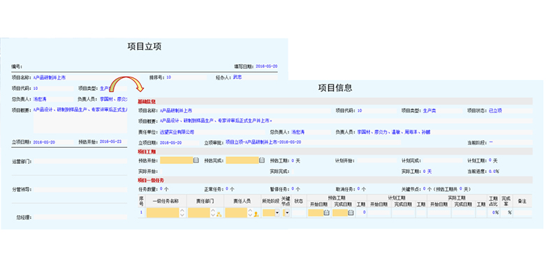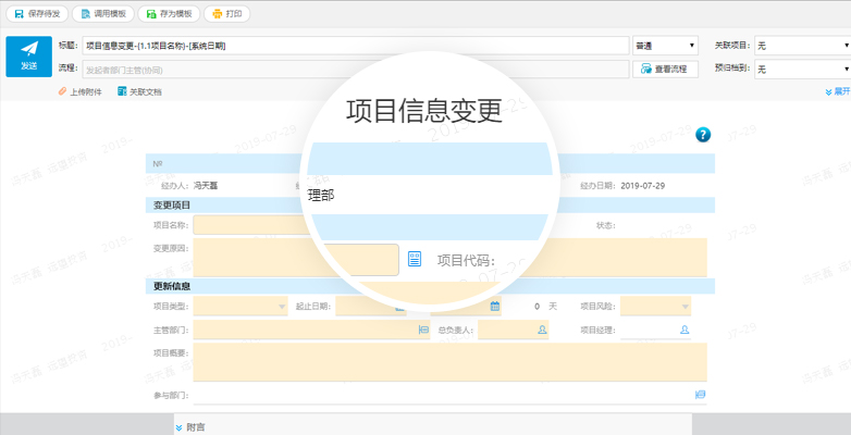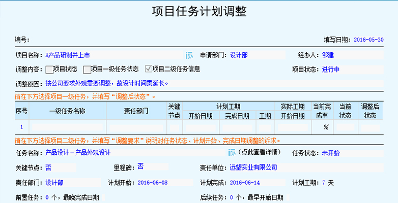 填寫變更信息的內(nèi)容后,經(jīng)相關(guān)部門及管理者審批后,系統(tǒng)自動(dòng)更新項(xiàng)目信息。