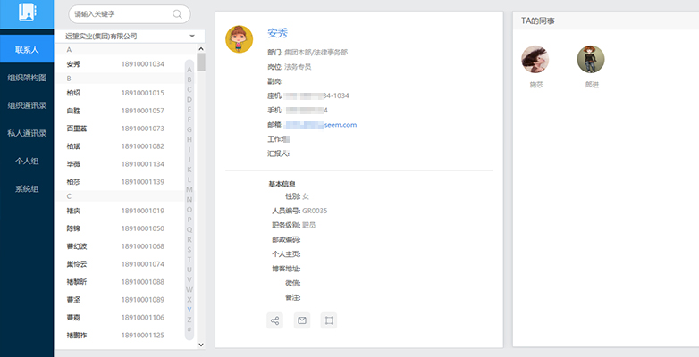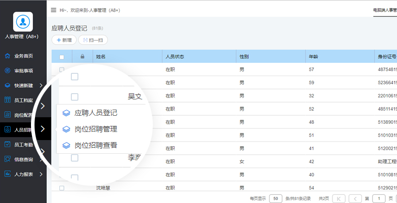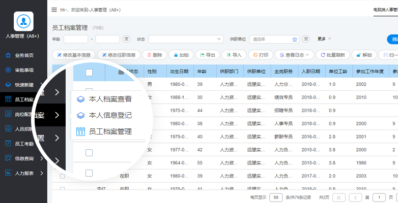 支持對員工檔案信息的存儲、修改維護(hù),以及管理職權(quán)維護(hù)。