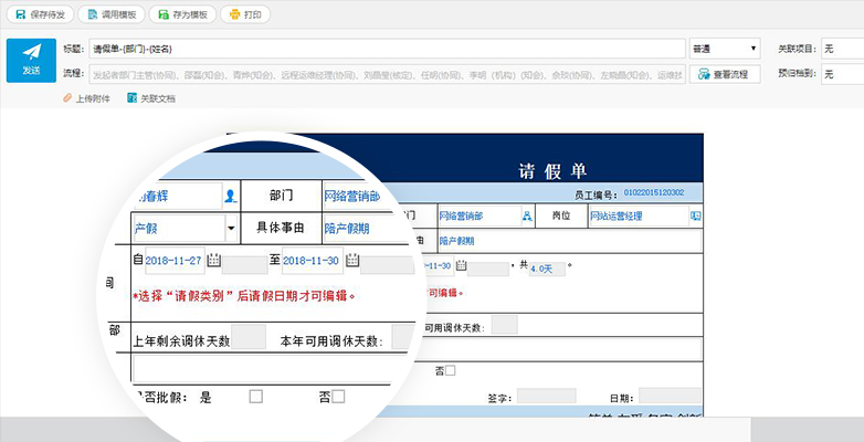 支持對員工的加班、調(diào)休、假期申請等內(nèi)容進(jìn)行流程發(fā)起和審批。