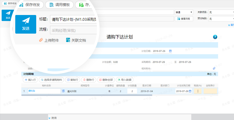 采購部門可發(fā)起采購申請、采購計(jì)劃,并生成請購檔案、采購計(jì)劃檔案。