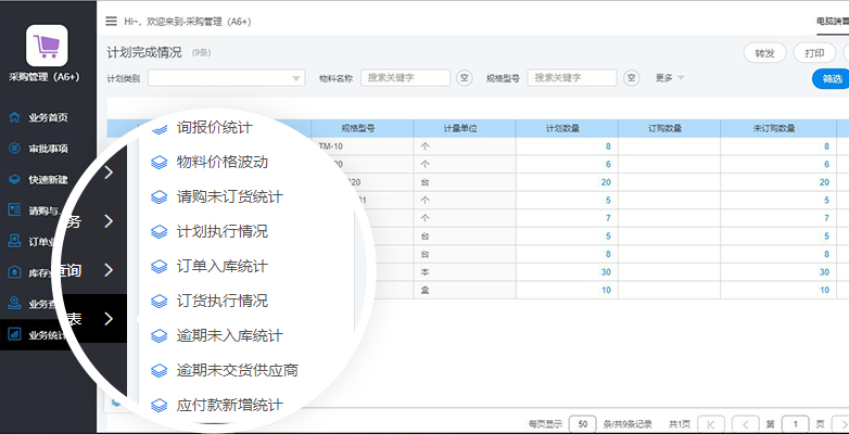 支持請購訂貨、計(jì)劃訂貨、物料報(bào)價(jià)和訂單執(zhí)行的報(bào)表統(tǒng)計(jì)