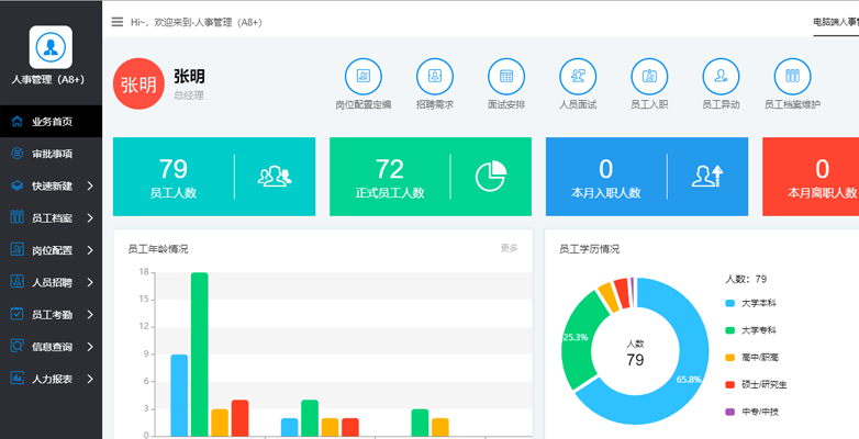支持自定義常用功能入口;快速掌握人事管理的相關(guān)信息,并以圖表形式呈現(xiàn)。
