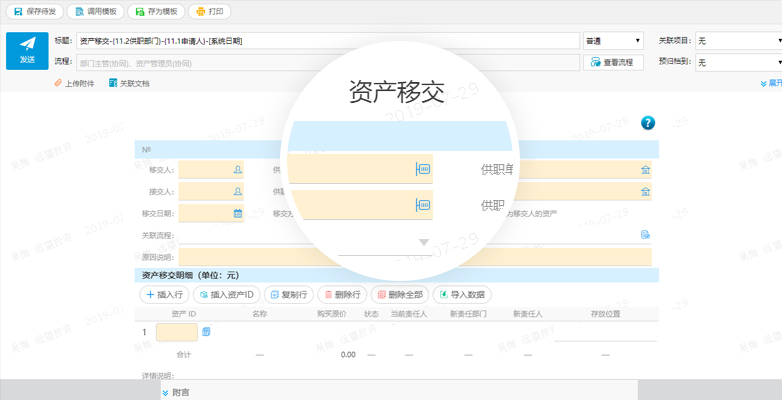 支持資產(chǎn)的調(diào)配、移交、贈(zèng)出、轉(zhuǎn)讓、報(bào)廢和報(bào)損等流程審批。
