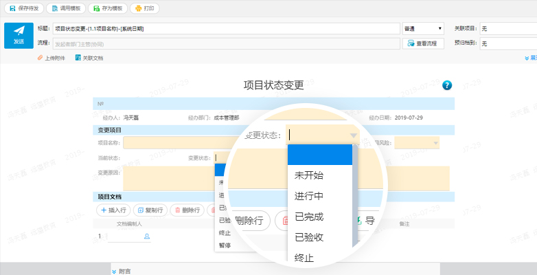 根據(jù)要求填寫變更后的狀態(tài)和變更原因,經(jīng)相關(guān)部門及管理者審批后,系統(tǒng)自動(dòng)更新項(xiàng)目狀態(tài)。