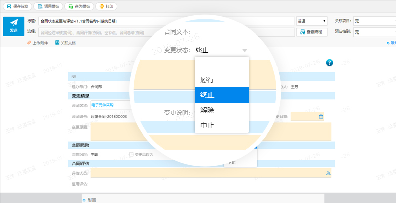 支持對合同內(nèi)容的變更、補(bǔ)充,以及合同狀態(tài)變更與評估。